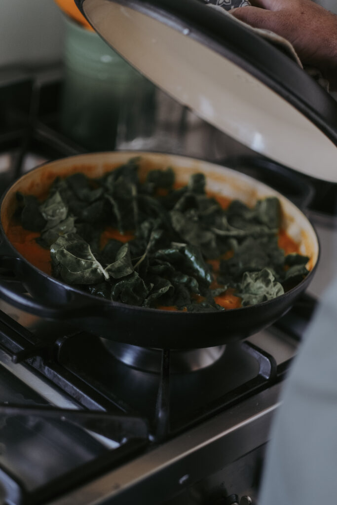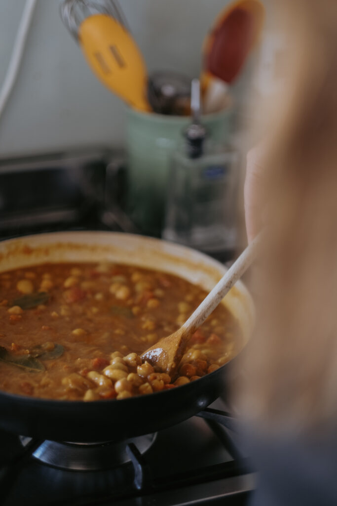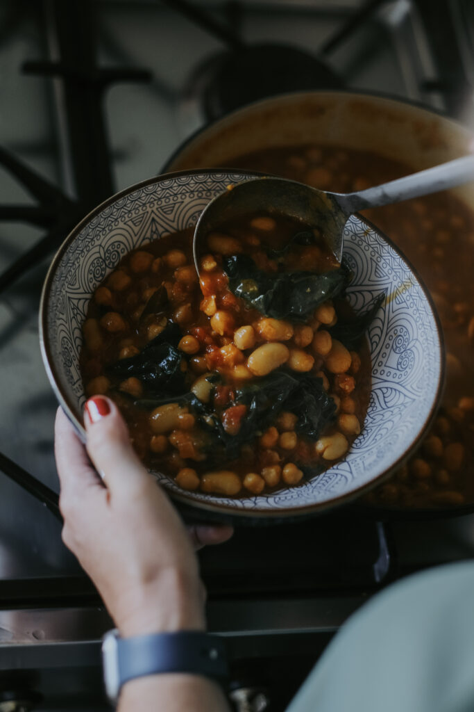 - After 30 minutes add the chickpeas and beans and cook for a further 10 minutes. Then add half of the spinach, allowing it to wilt down before adding the rest. Season lightly with salt and pepper (if necessary).
